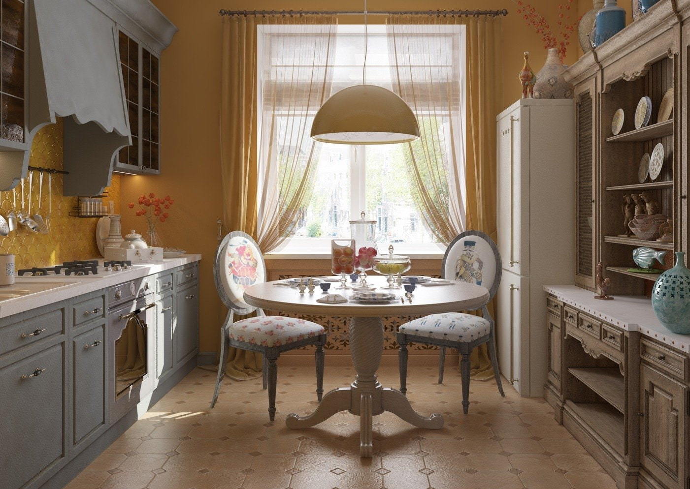 In the photo there is a compact round white table by the window in the interior of a Provence-style kitchen.