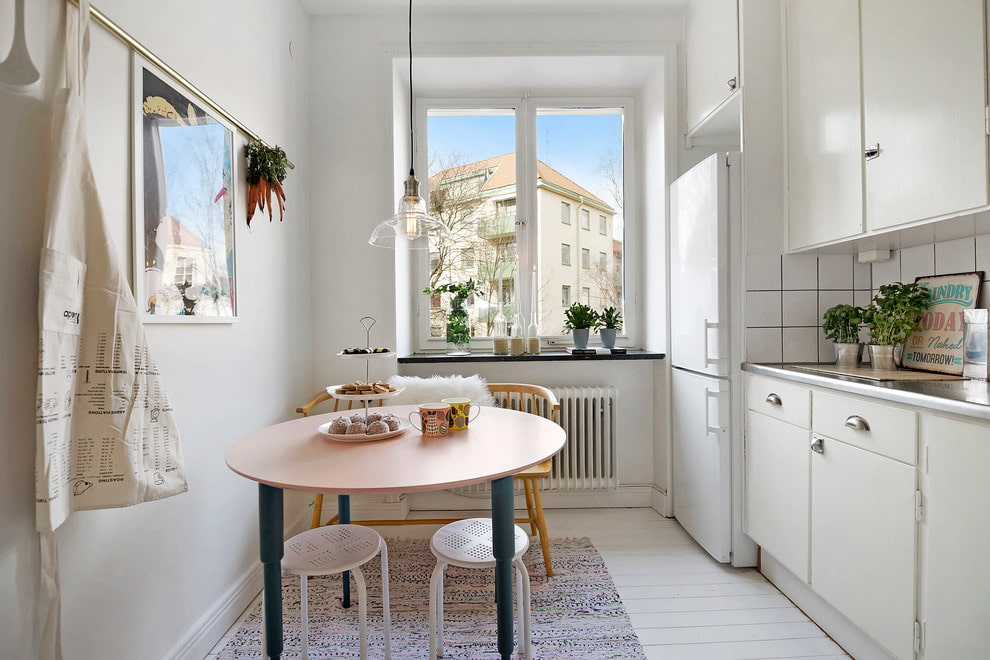 For a small kitchen, a round model equipped with one leg, located by the window, a folding table located against the wall, or an original and compact corner design, perfect for a small family and providing not only maximum space savings, but also very comfortable everyday use, is suitable.