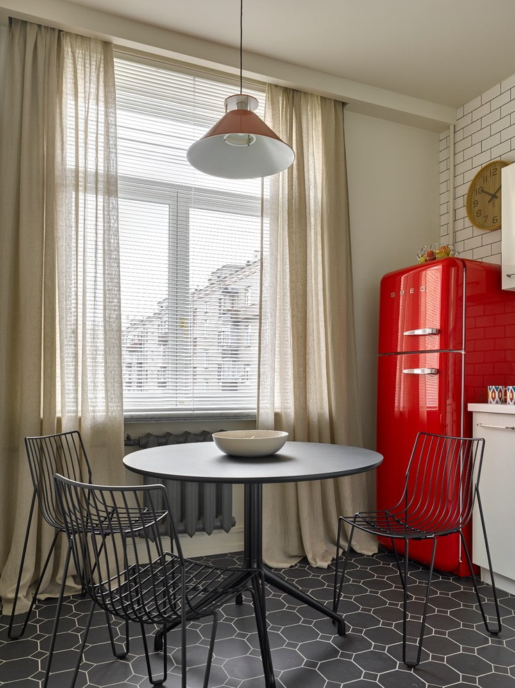 In the photo there is a round plastic table in red in the interior of the kitchen-living room.