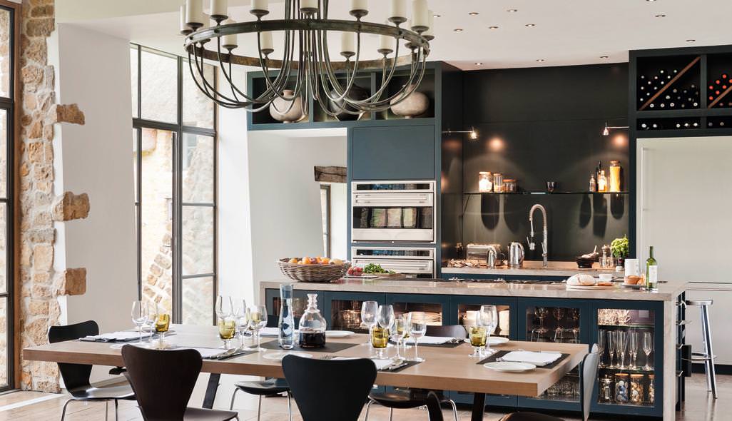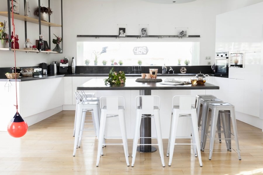 A cafe-style kitchen must have a bar counter, even if it is quite small. If the kitchen is very small and you cannot find a suitable counter on sale, you can build a counter divider between the kitchen and the living room, or use a console table. The window sill can be turned into a bar counter or sofas with soft seats can be placed next to the window - this will match the style well.