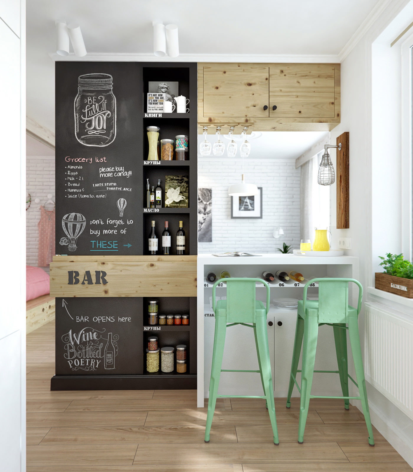 Small bouquets of flowers in vases, a board on which you can pin your home menu, or even better - one on which you can write it with chalk, will become a pleasant and stylish addition.