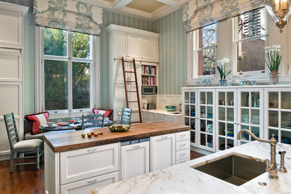 The mood and the necessary color will help to give photowall-paper with a suitable image, but you need to use them on a small area, you should not decorate the entire wall with them. False windows are often used in the design of a cafe-style kitchen. They can be mirrored, luminous, or with an insert from a photo wallpaper depicting the views that can be observed from the windows of a small restaurant or street cafe.