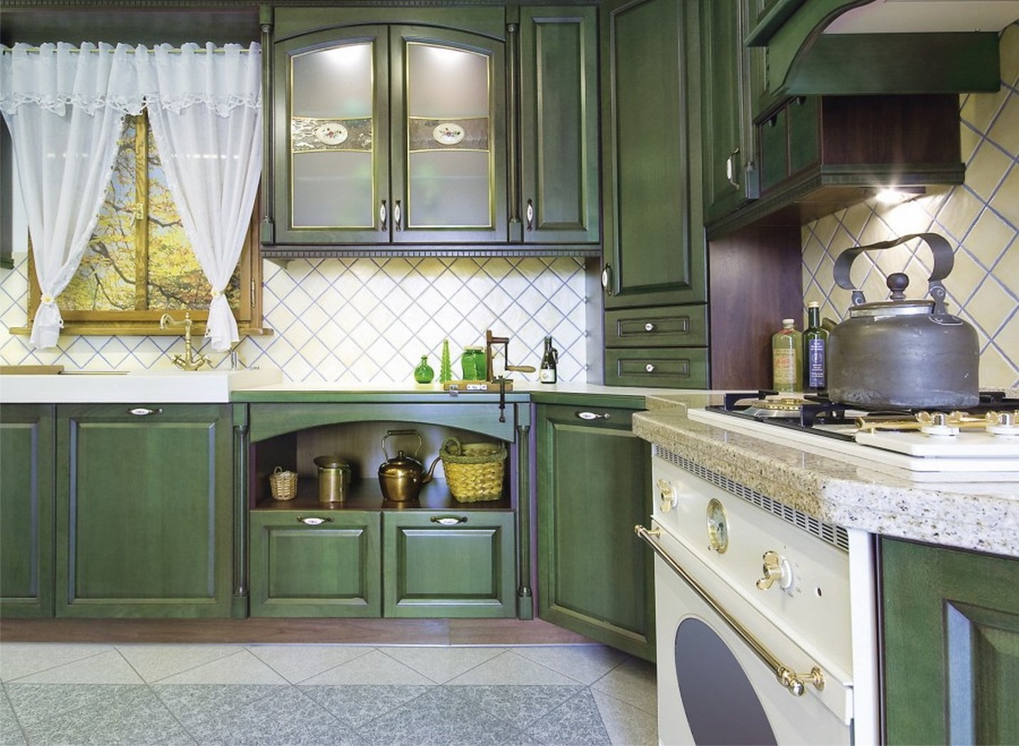 Kitchen set in Provence style, mainly distinguished by an old and vintage look. A wood-topped design works well with a white ceramic sink or a sink with copper and bronze taps.