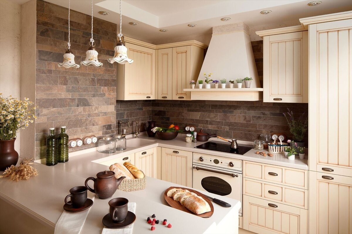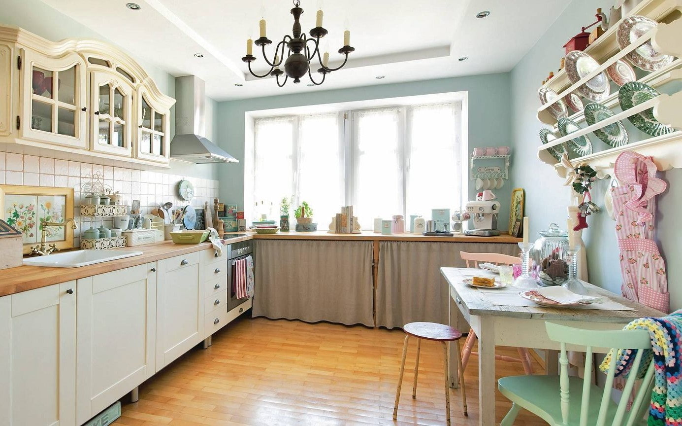 In the kitchen, they place closed cabinets and open shelves that are filled with decorative elements, sets, vases, spice jars, painted plates and other accessories.
