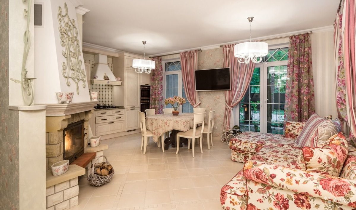 The photo shows the design of a spacious kitchen-living room with a fireplace, decorated in Provence style.