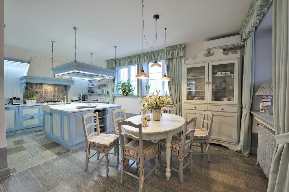 The photo shows the decorative design of a spacious kitchen in the Provence style.