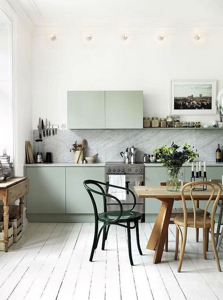 This color is often used in Provence style kitchens, coloring the bottom in pastel mint. In this case, the top can be in natural wood, yellow or the same as the bottom.