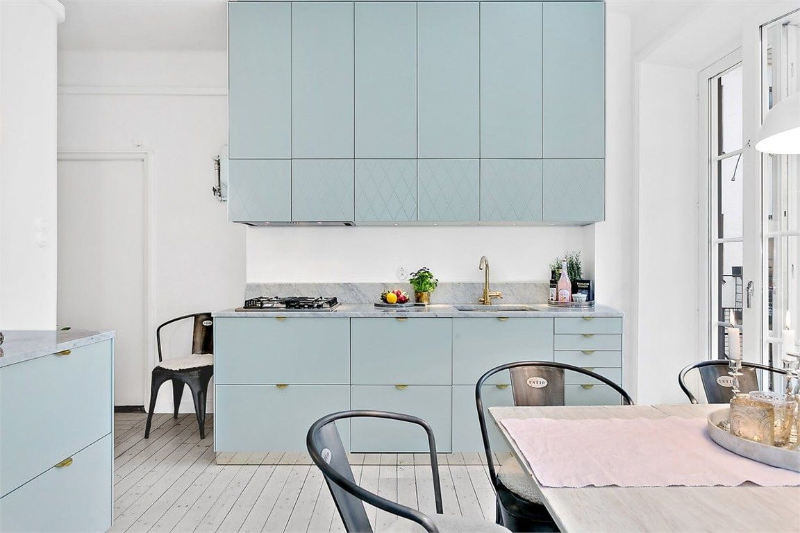 Scandinavian... Do not think that the real scandi is only white, gray and wood. Cold pastels fill with light no worse than the listed options. Menthol is used muted, matte and diluted with white in finishes and décor. The theme will be dark, even black pens.