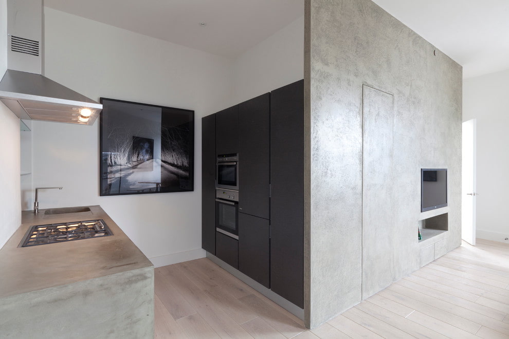 The photo shows the interior of the loft-style apartment and the kitchen in a niche decorated with spotlights.
