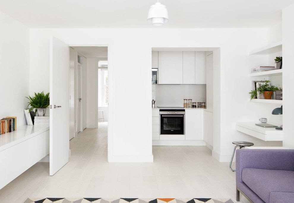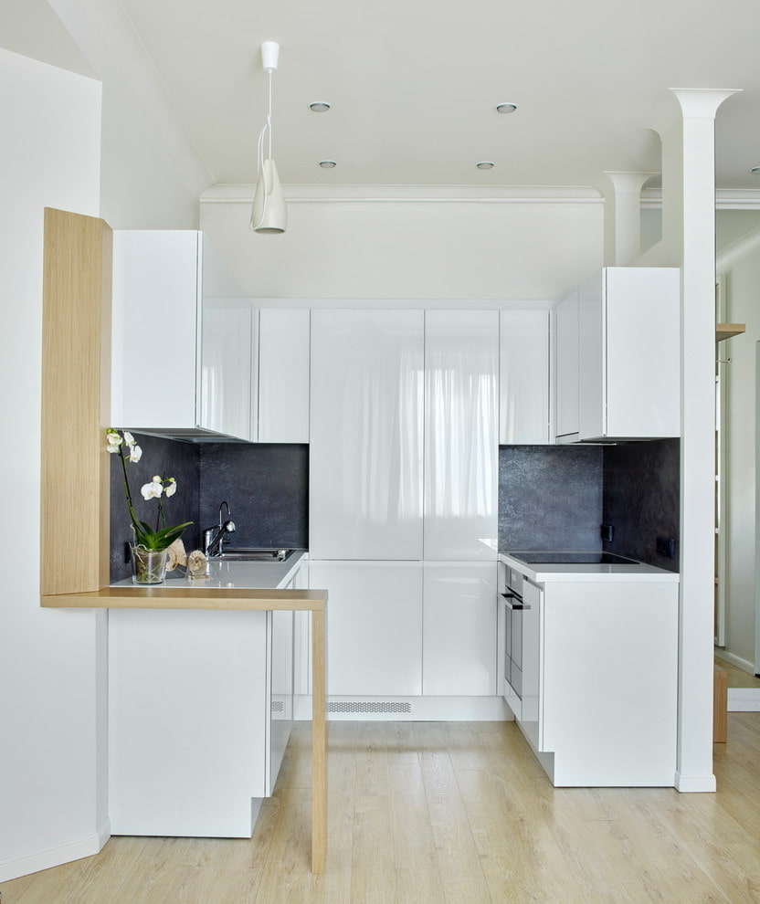 The photo shows the interior of the apartment and a niche with a kitchen made in white.