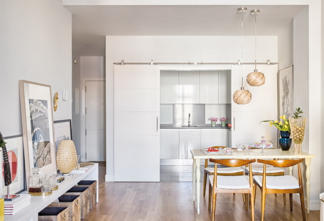 - Furniture with drawers, folding or sliding tabletops and cabinets up to the ceiling are also used, which visually increase the volume of space.
