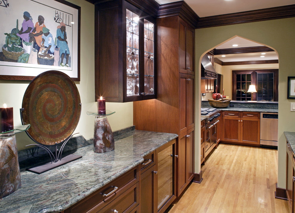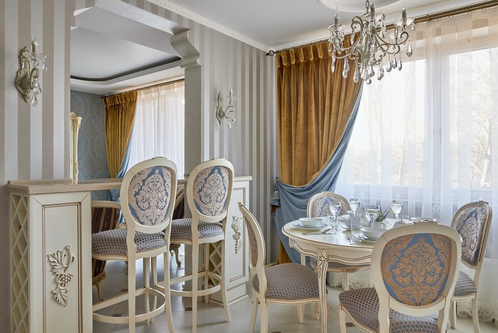 Round or rectangular openings with a characteristic decor in the form of stucco moldings, central keystone, columns and other luxurious elements are perfect for a classic kitchen interior.