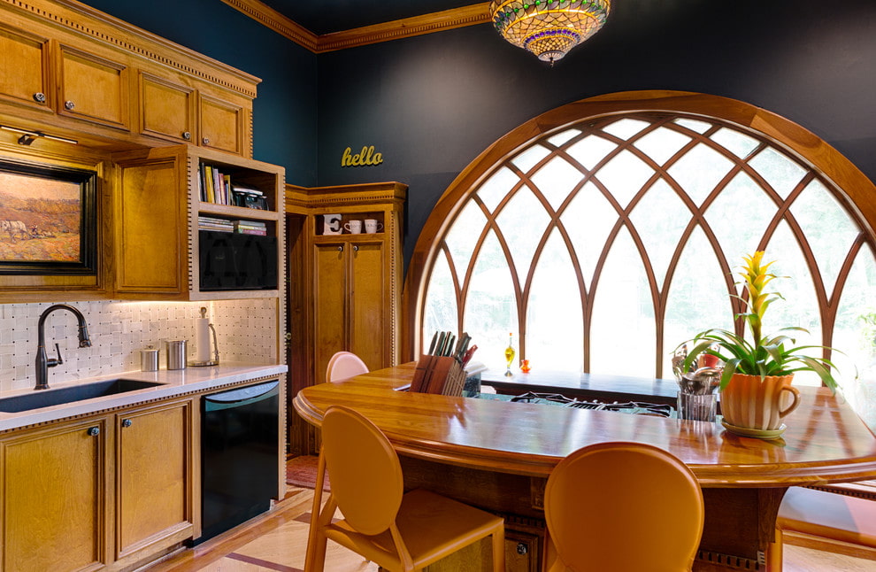 Windows of this configuration look quite impressive. Arched window openings add a light medieval touch to the kitchen, making the setting interesting and elegant.