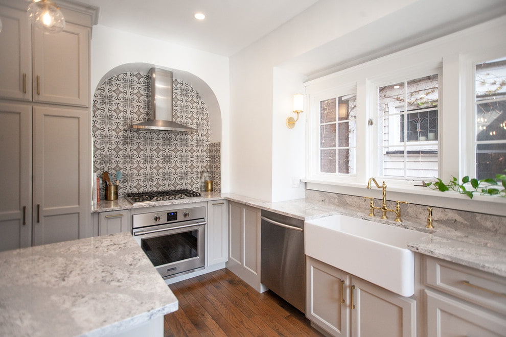 In the photo there is a kitchen design with a decorative arched structure in the design of a working area with a stove.