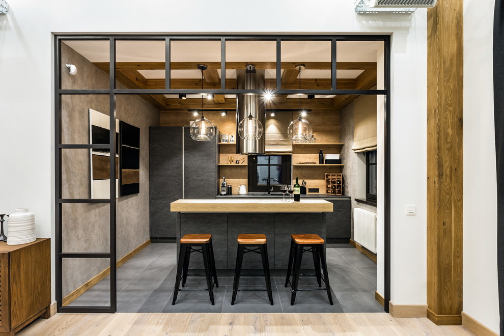 To give the kitchen interior a medieval look with a touch of wealth and splendor, an opening decorated with stone will help. It is appropriate to dilute the kitchen design due to the arch with brutal and contrasting cladding with artificial or natural bricks.