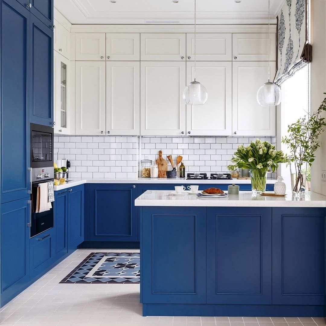 A classic simple option is a blue and white kitchen design. If you add red to this range, you get a harmonious interior in a nautical style.