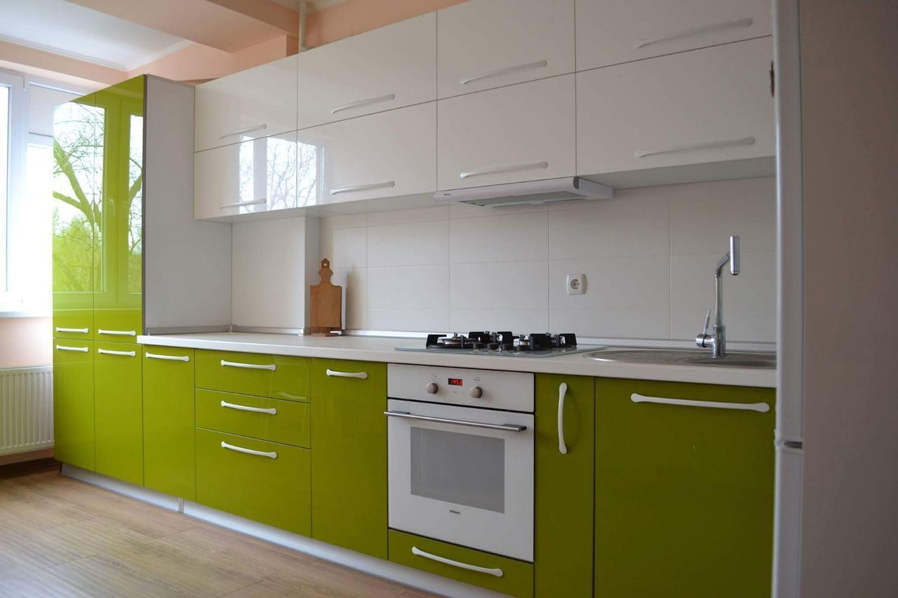 One of the most popular shades in kitchen design lately. Light green on the upper facades is harmoniously combined with black or dark chocolate. The noble emerald is perfectly complemented by light vanilla, ivory, and almonds.