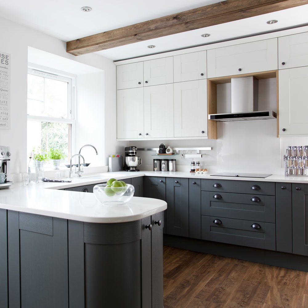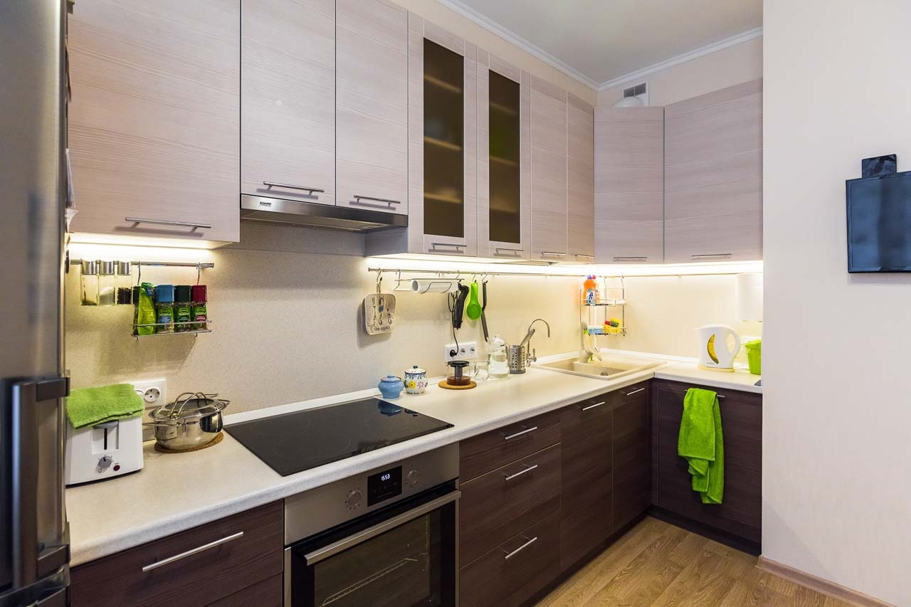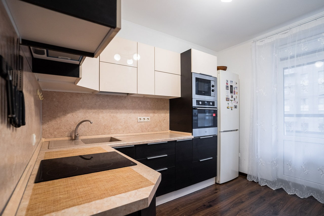 When choosing a two-tone kitchen set, consider your room size and contrast level.The smaller the kitchen, the less dark, contrasting and saturated furniture should be.