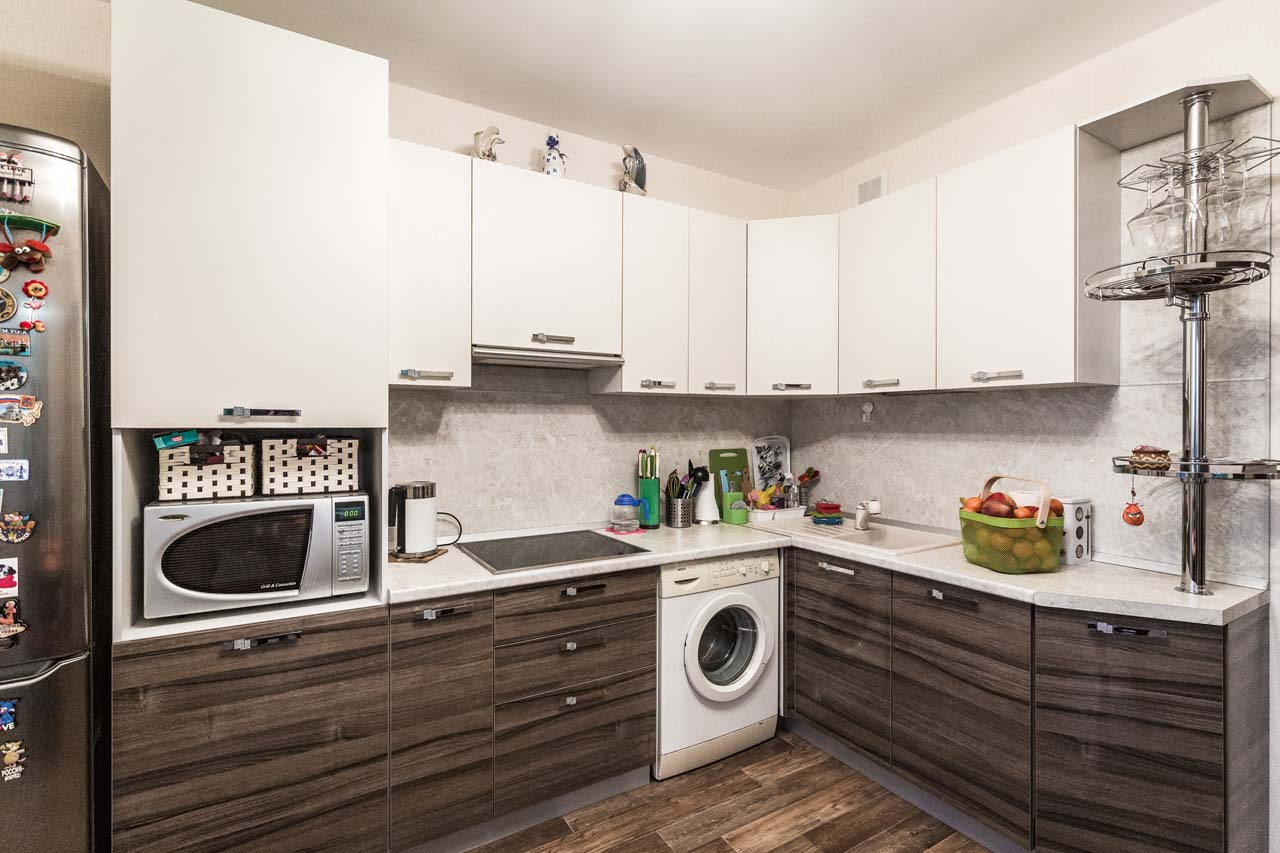 In the photo, neutral kitchen appliances