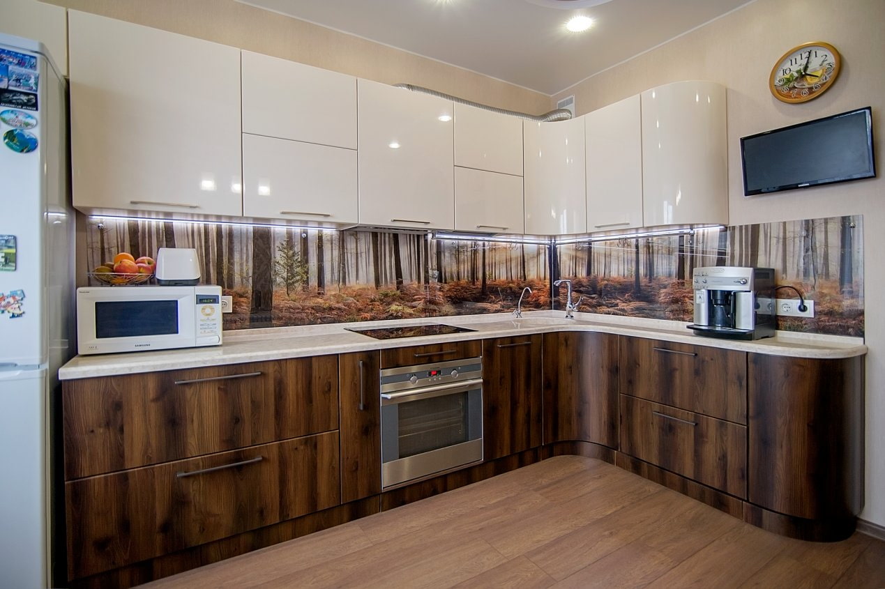When decorating the kitchen with a light top and a dark bottom, do not forget that there is a protective apron between the cabinets.