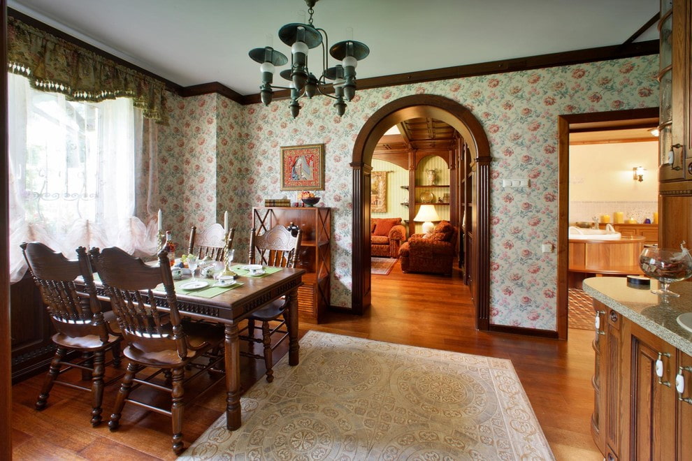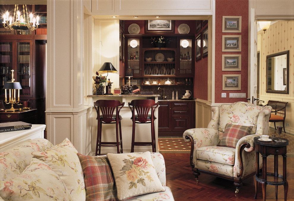 The prim, democratic and noble design of the kitchen-living room in the English style allows you to leave only household appliances in the kitchen area, and move the dining group with chairs to the hall. For visual zoning of the combined space, different wall finishes are used. In this case, the living room is covered with wallpaper with plant motifs, and the kitchen is decorated with wooden panels or painted in a light color.