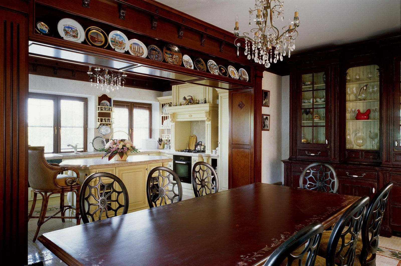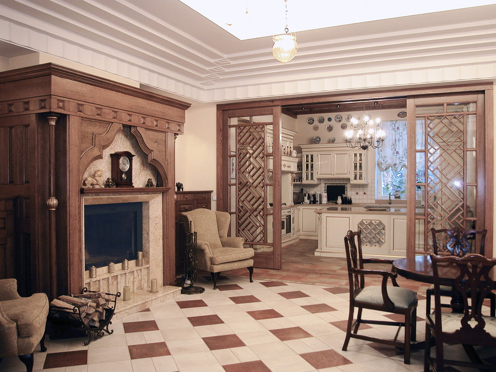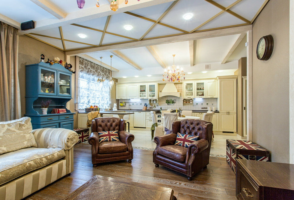 The photo shows a large kitchen combined with a dining room and living room in the English style.