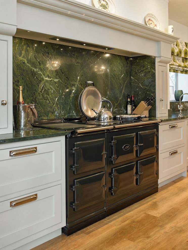 In the English kitchen, a luxurious stone or ceramic sink with a bronze or brass two-valve mixer is installed, and they also have a voluminous stove with many burners or two ovens. The hob is equipped with an exhaust pipe stylized for the overall design of the room.