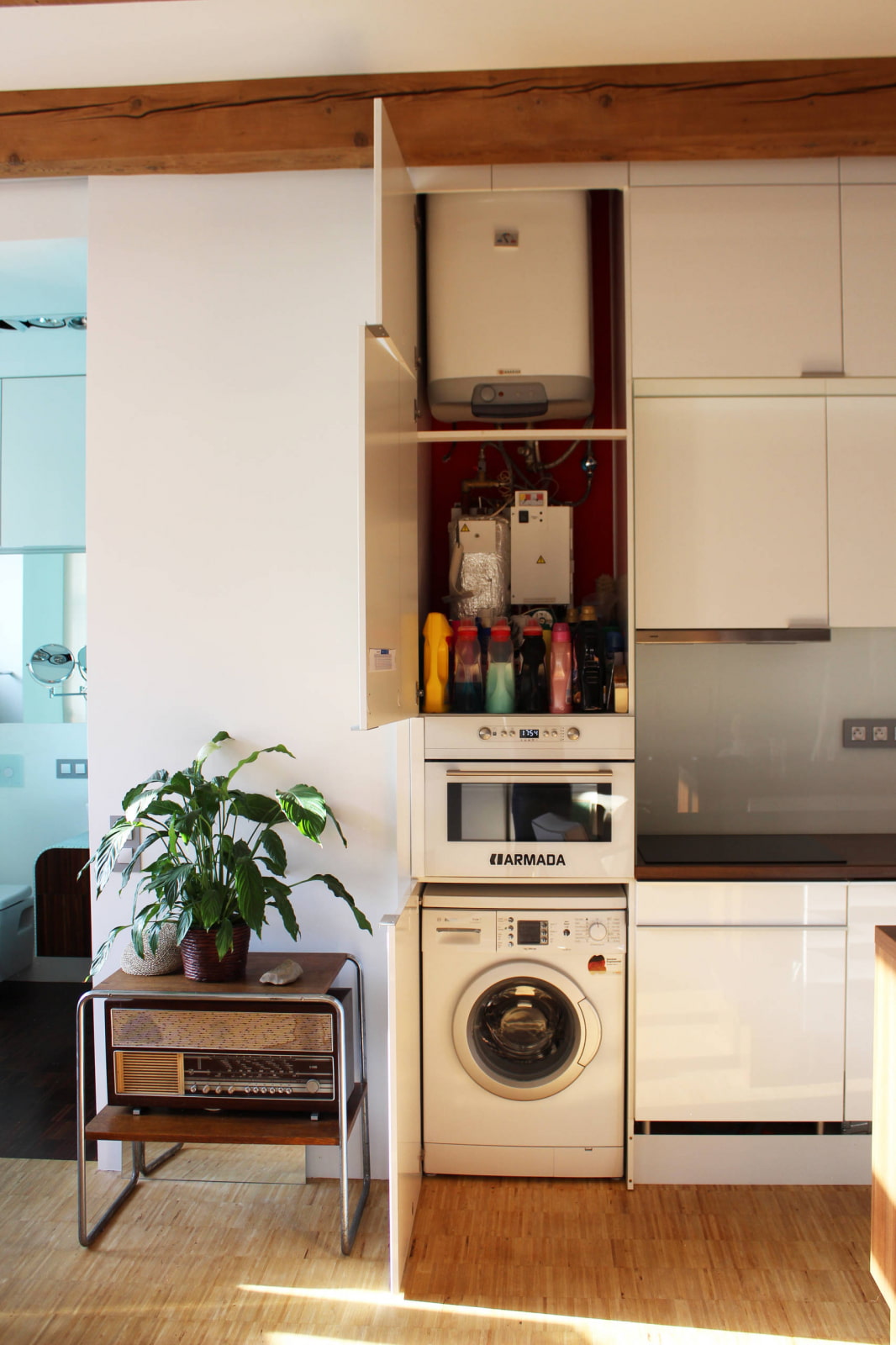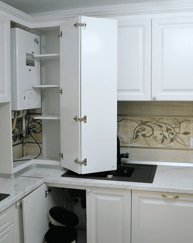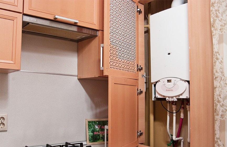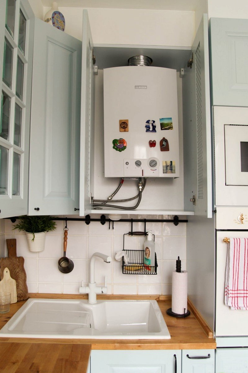 The photo shows the gas equipment, which is located above the sink. Surrounded by wardrobes, the column is not noticeable at first glance and does not attract attention.
