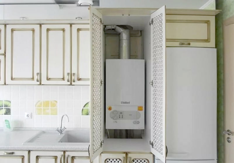 It is important that the gas water heater in the interior of the Khrushchev's kitchen looks like a single whole with it. There are many design examples where the device remains visible and fits perfectly into the environment. But for a classic-style kitchen, this option is not suitable. The column is either hidden behind a solid facade, or hidden behind a door with additional ventilation holes in the form of a decorative grill.