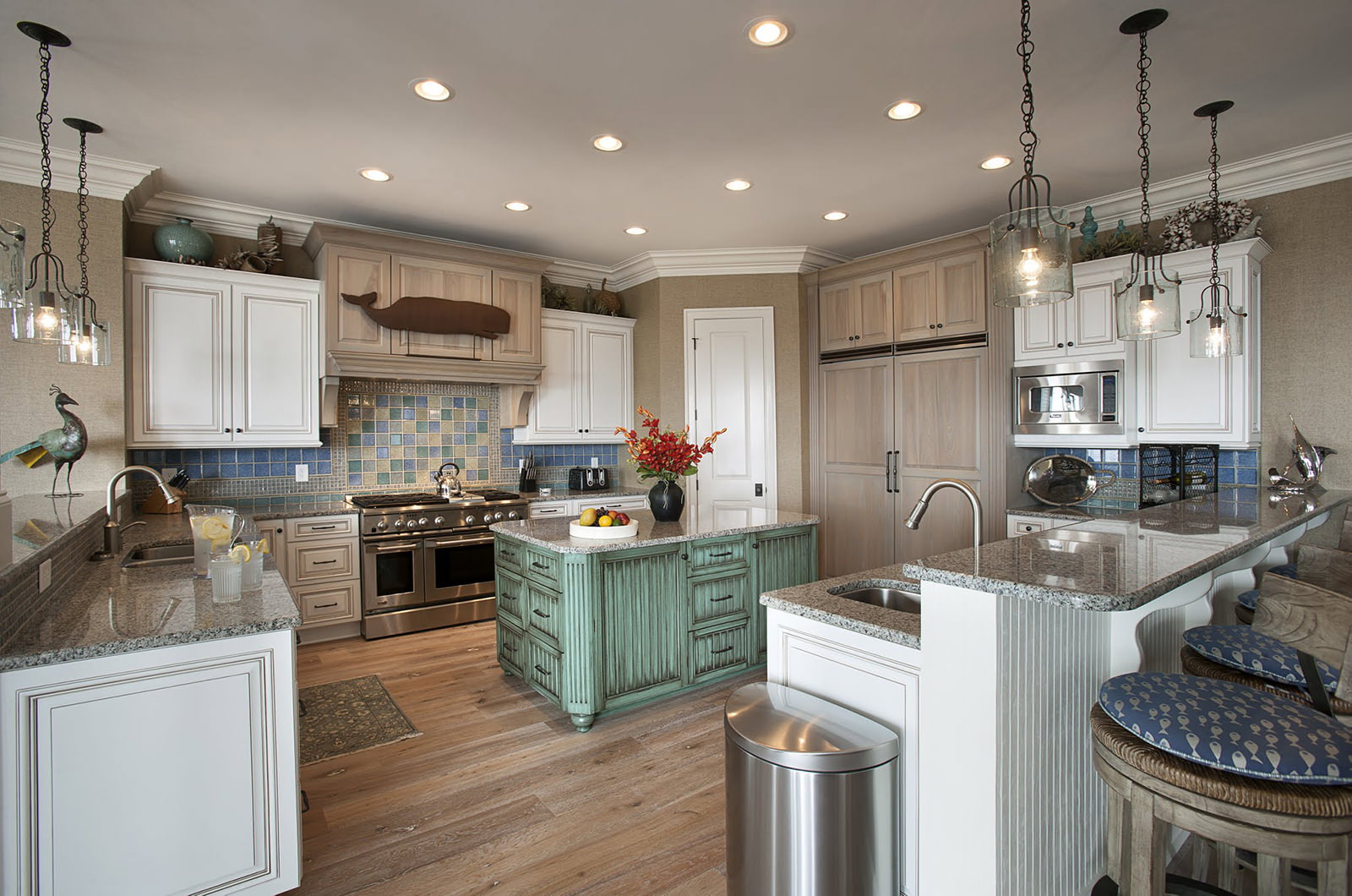 A nautical kitchen design can be created by laying out a mosaic panel depicting a sailboat or scenes from underwater life.