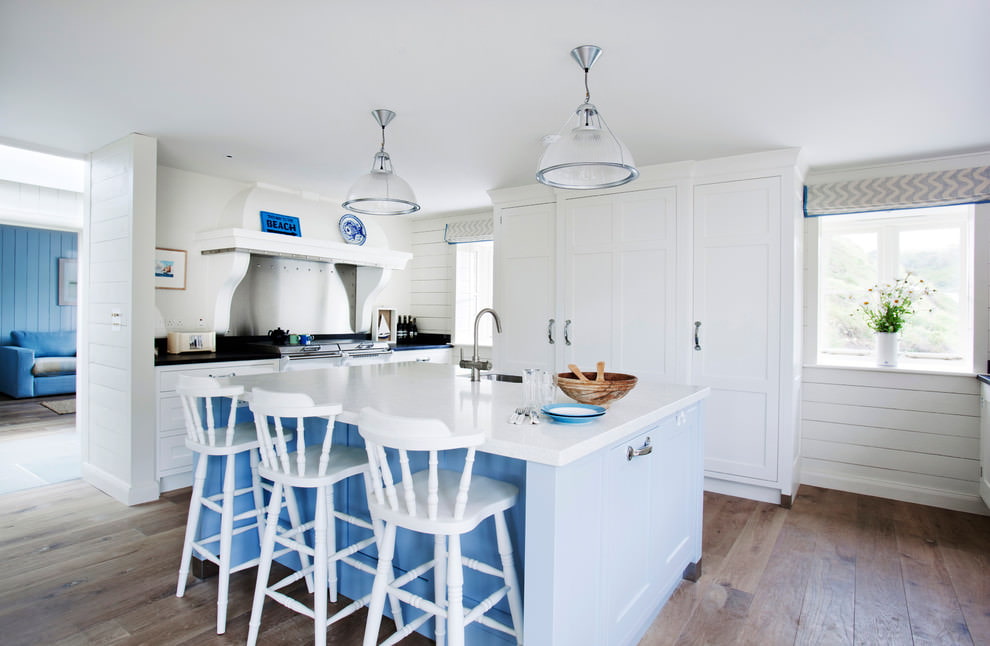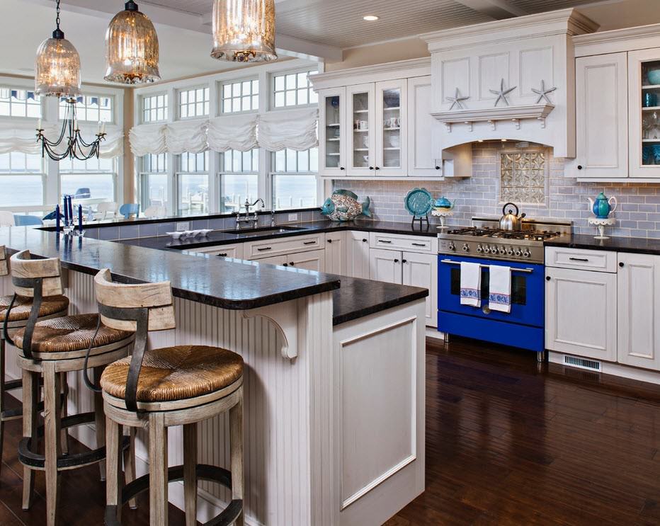 The tones that are used to decorate the kitchen in a nautical style should be close to natural. Nothing too bright and deliberate. The main ones are the colors of the sea, sand, sky, clouds, calm tones of greenery.