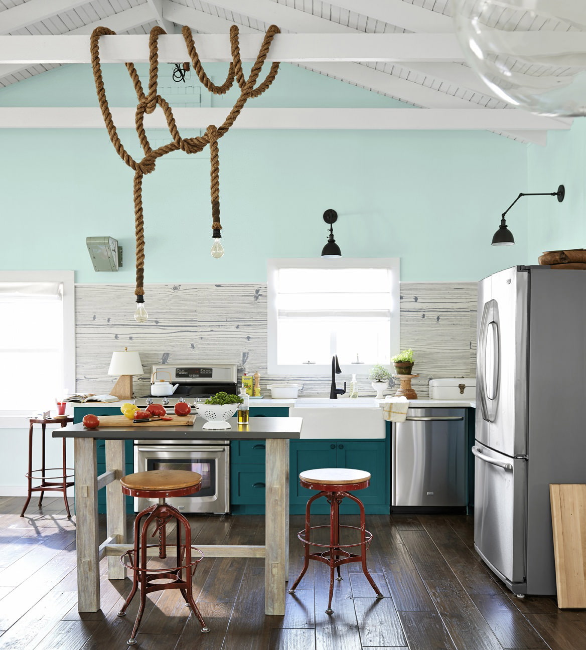 Natural materials are predominantly used in nautical kitchen design, as well as glass and brass. Jute and sisal panels and coverings also come in handy.