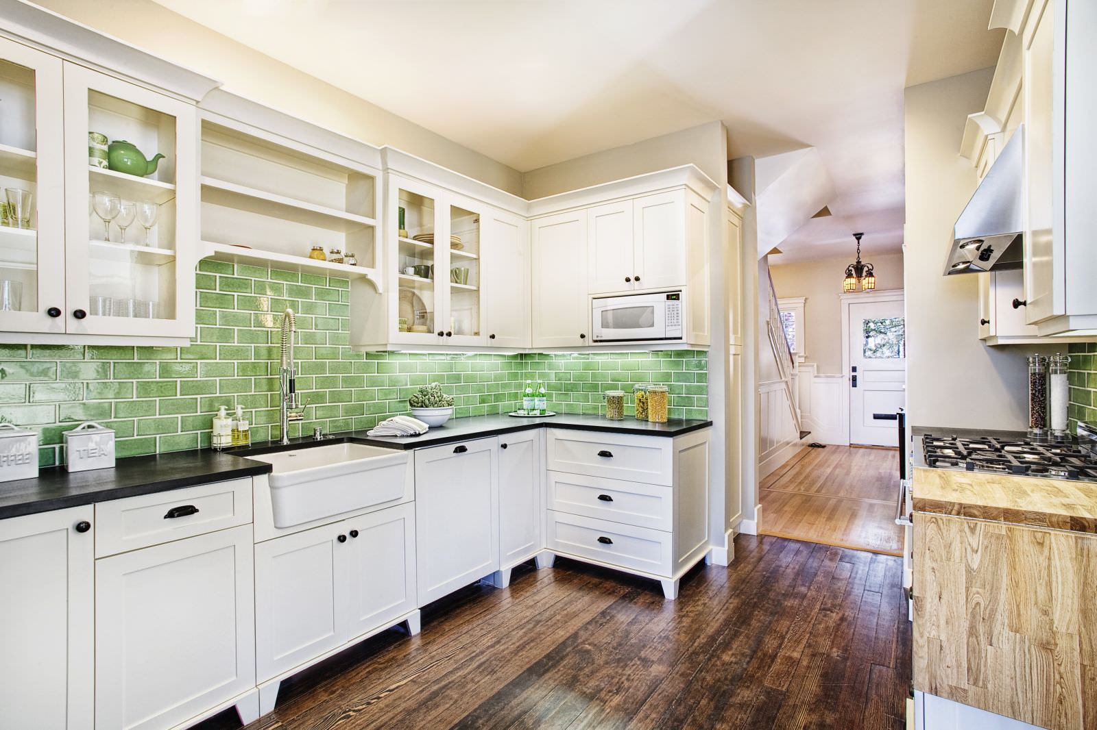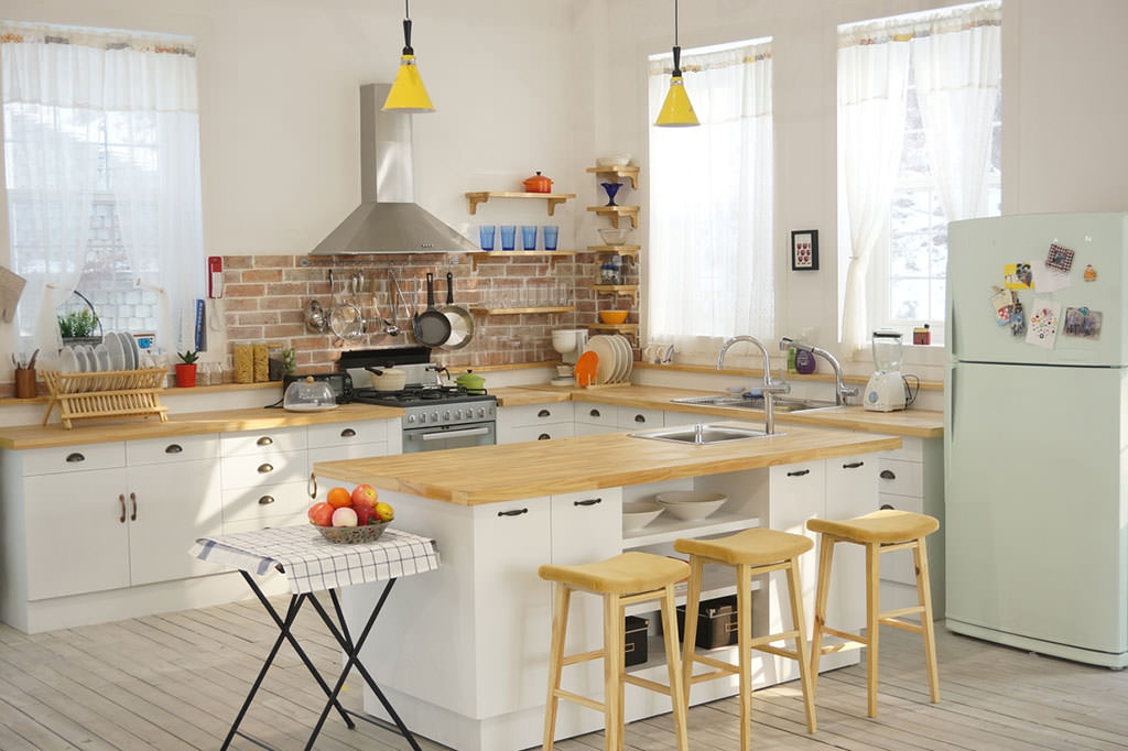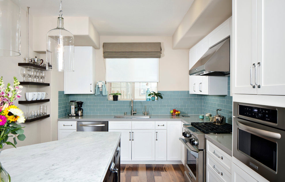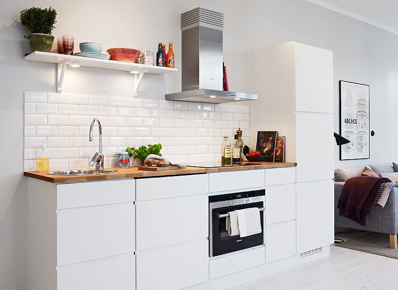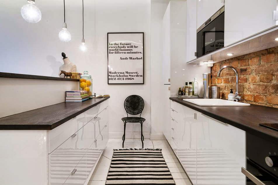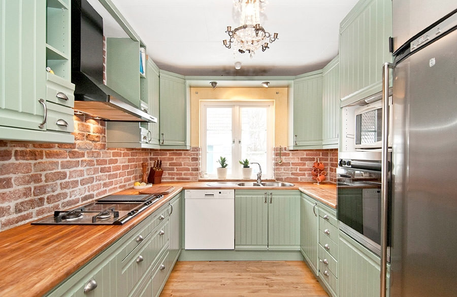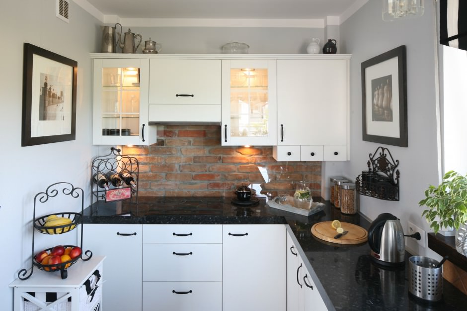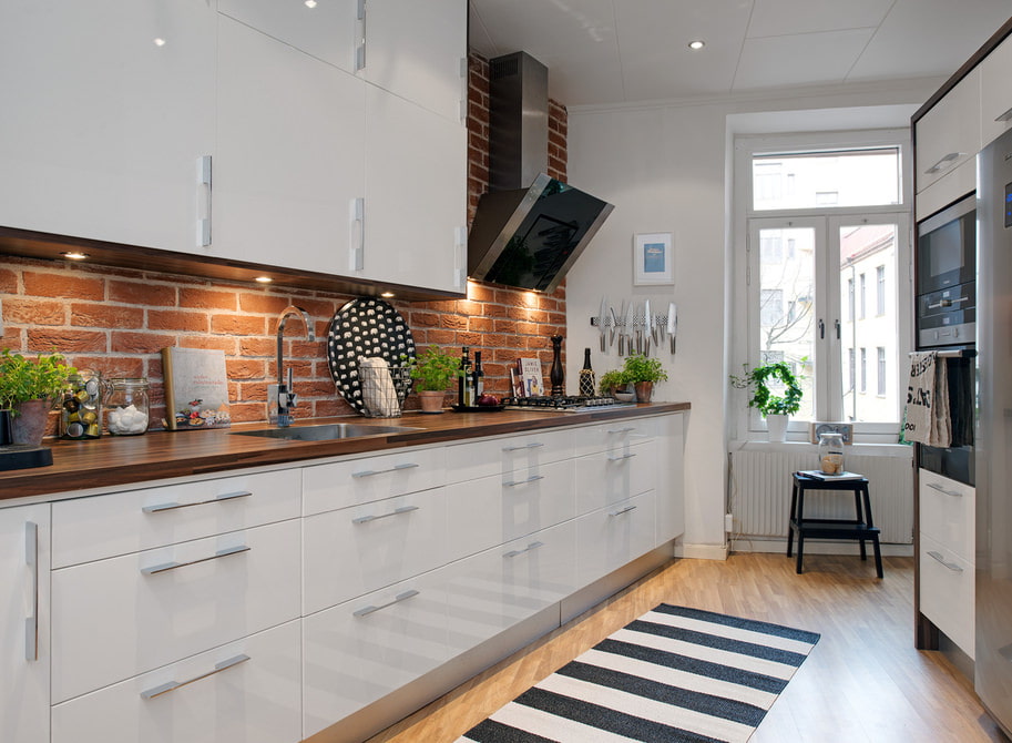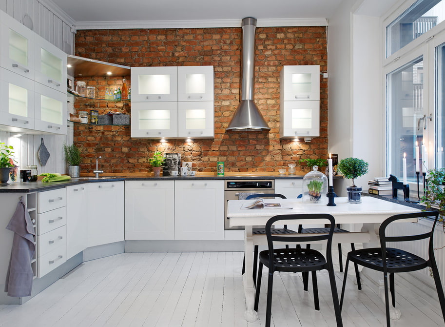 When choosing a brick apron as a decorative element for the kitchen, pay attention to the texture of its surface: it should not be coarse so as not to reduce the space and not to absorb grease and other contaminants. Such aprons are especially relevant in Provence styles, country, scandinavian or loft style.