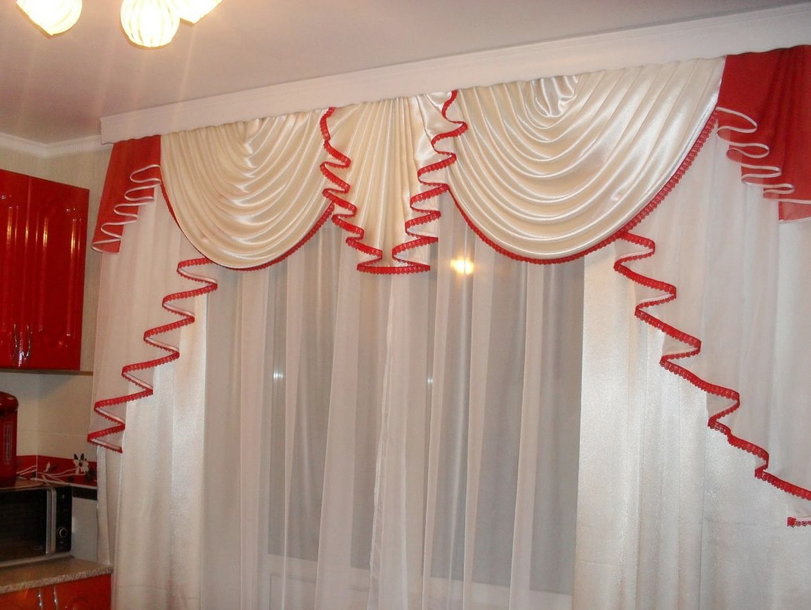 Lambrequins for the kitchen will emphasize and bring originality and beauty to the interior. Gracefully draped canvases impress with their magnificent appearance and complement any design project.