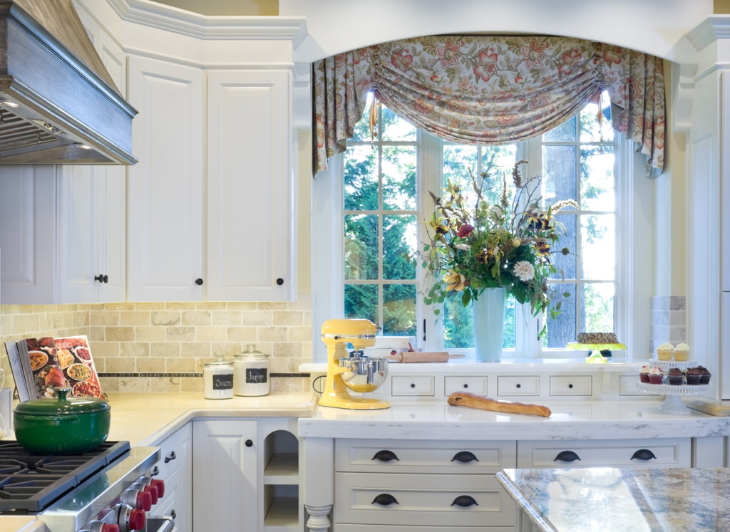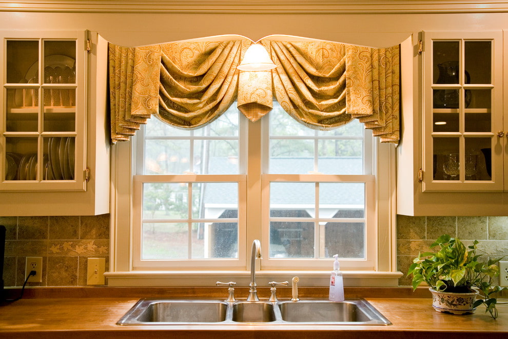 In the photo there is a country-style kitchen and a window decorated with swags.