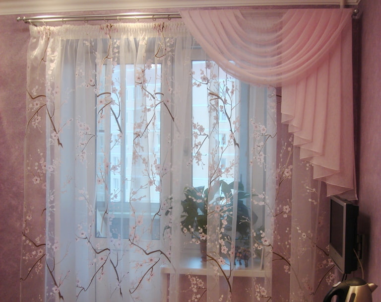 Or a garland. Form sagging semicircles with draped pleats at the top of the curtains. This decorative element is attached to the pipe at the edges or in the center.