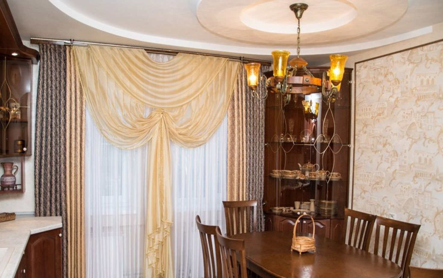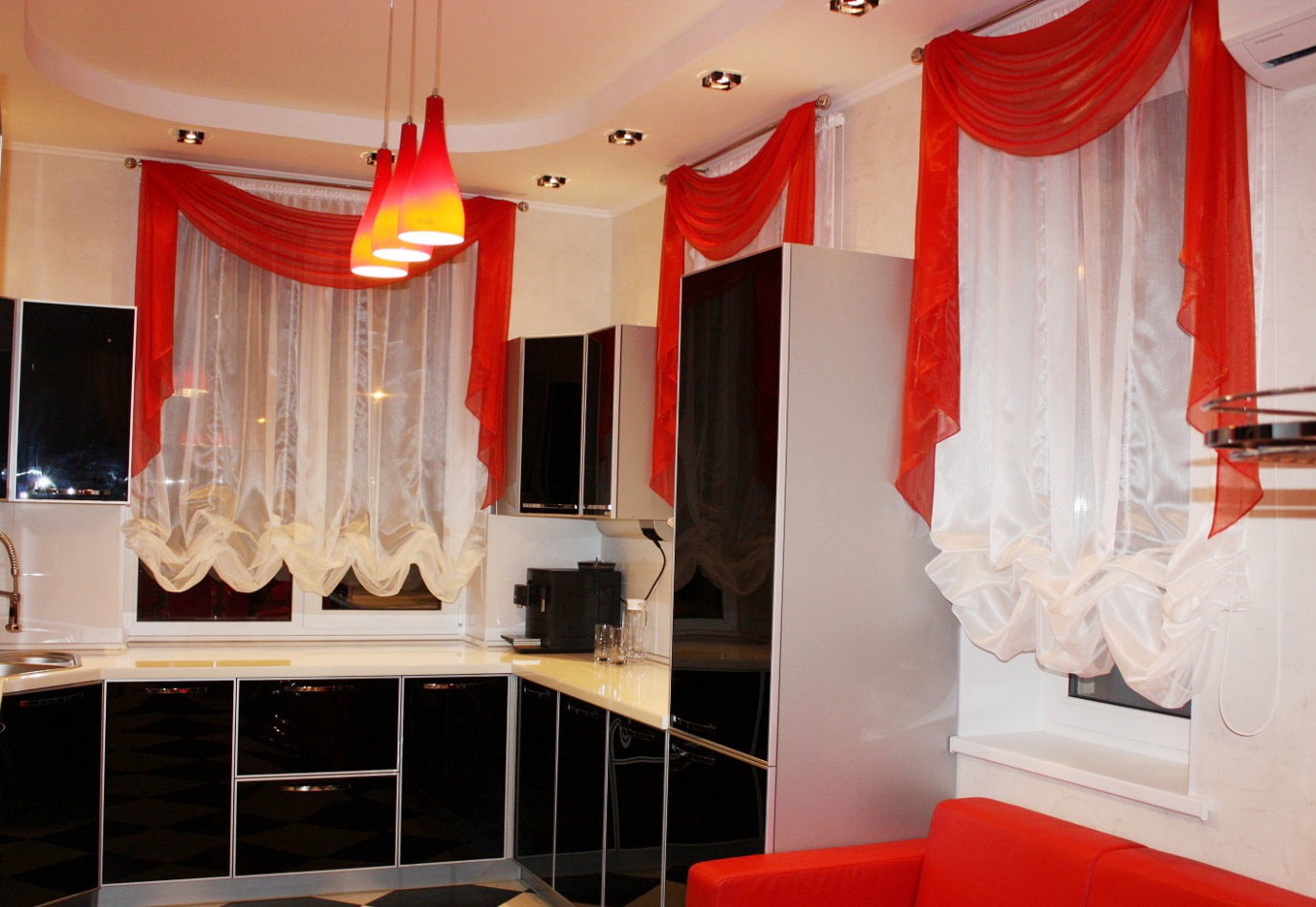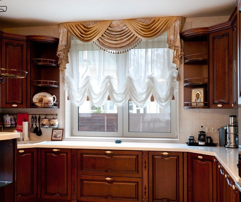 In the photo, the interior of the kitchen and lambrequins in the form of an arch on the windows.