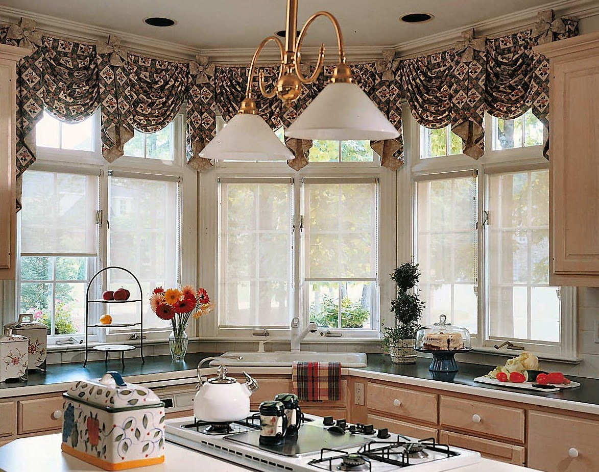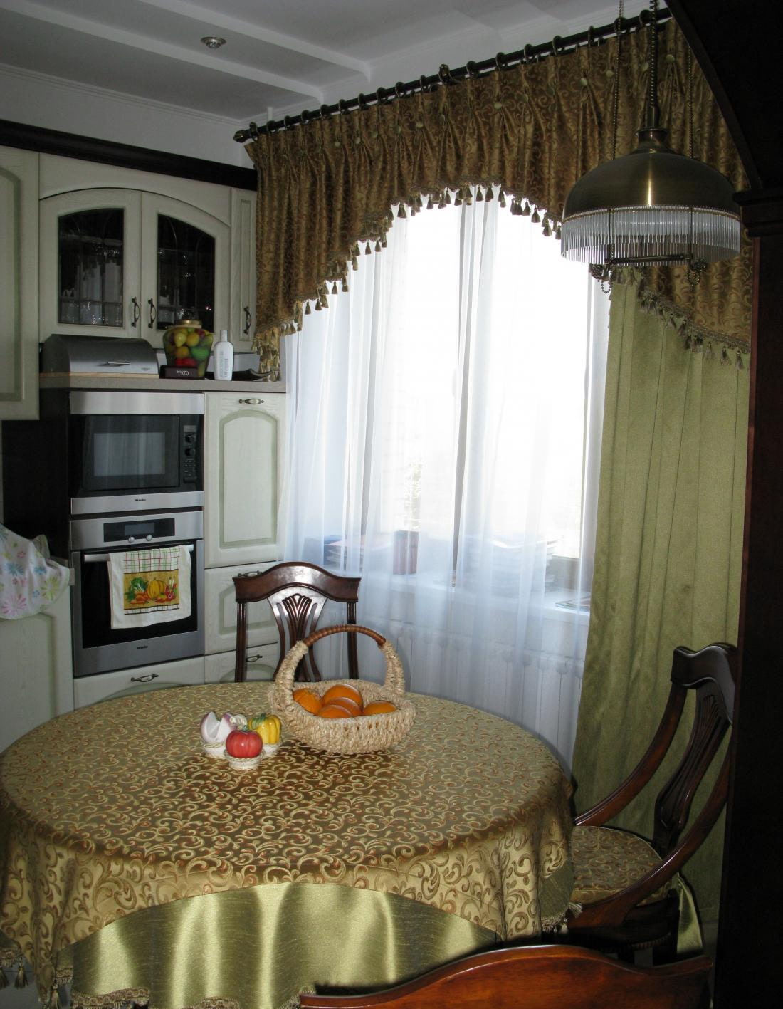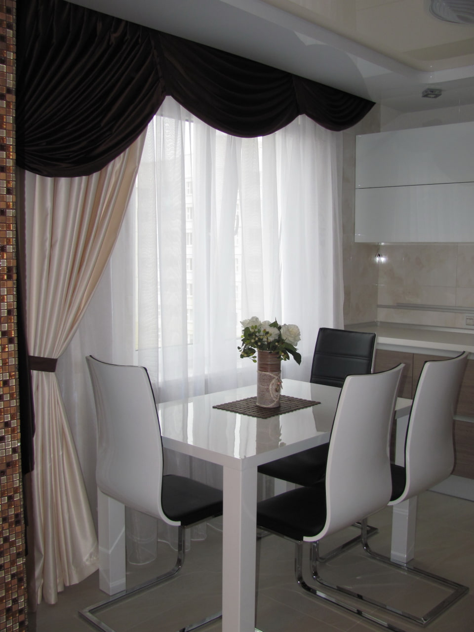 In the photo, the interior of the kitchen and lambrequins in the form of an arch on the windows.
