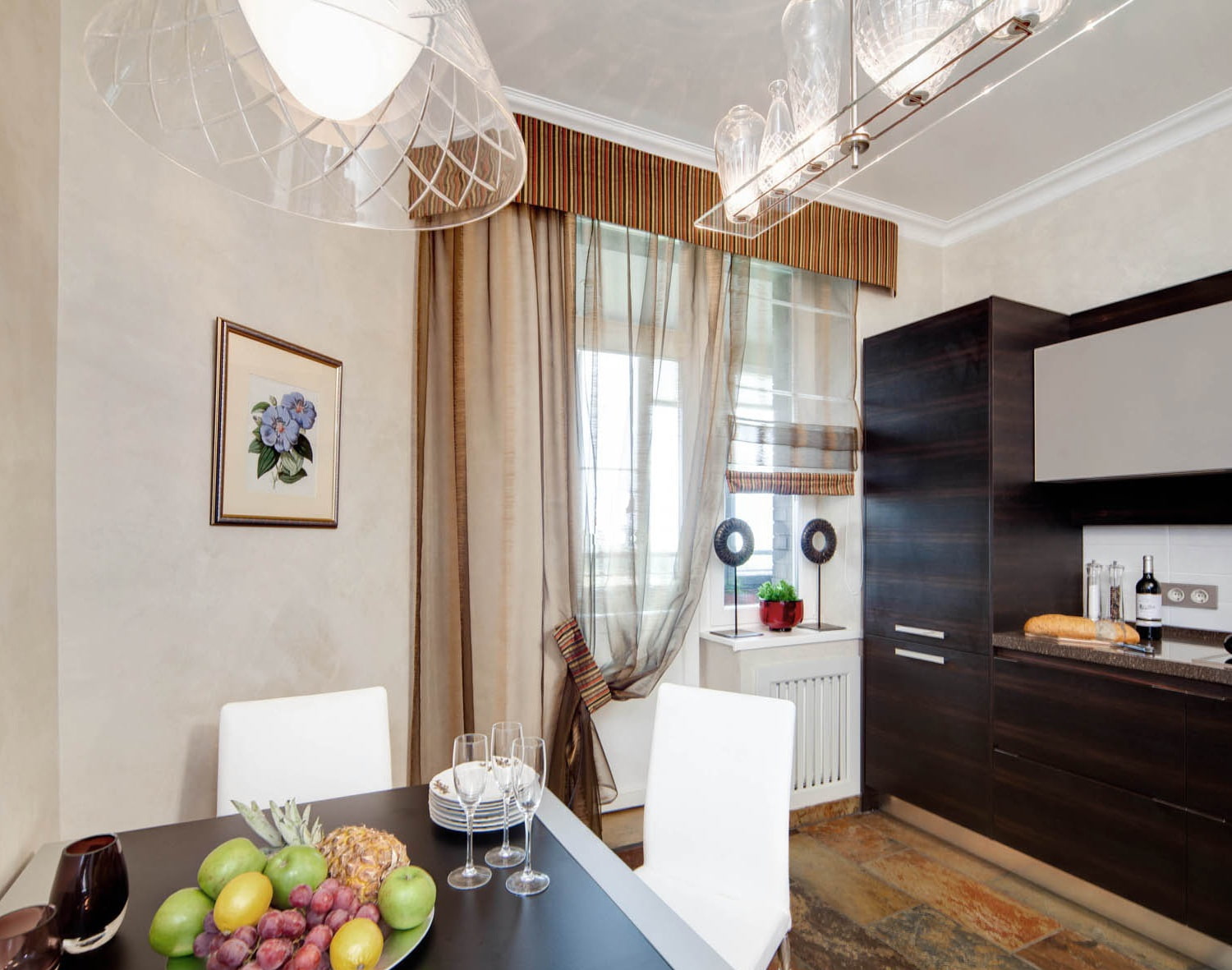 This classic version gives the kitchen a solemnity and elegance. Often, patterned curtains are complemented with lambrequins with similar motives.