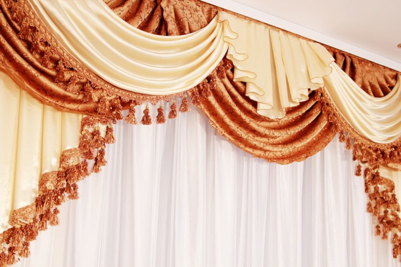 Swagi or semi-swagi decorated with fringes along the edge, look very funny and at the same time elegant. Fringe is often used as a decoration for velvet or taffeta fabrics.