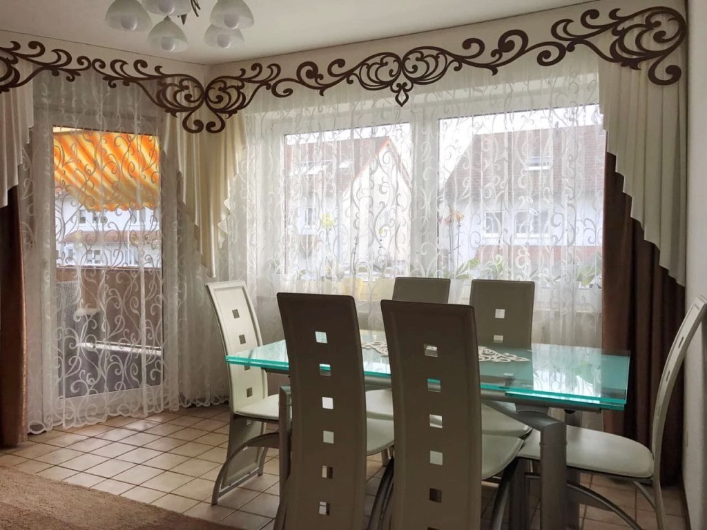 In the photo, the interior of the kitchen and windows with lambrequins decorated with fringe.