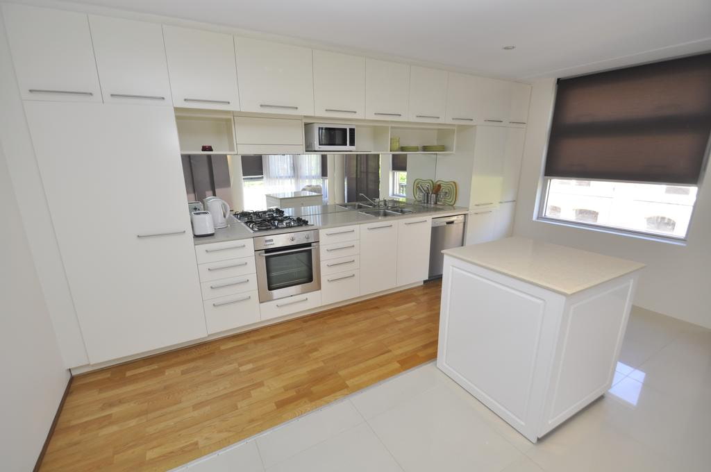 The photo shows the interior of a small kitchen with light-colored linoleum on the floor.