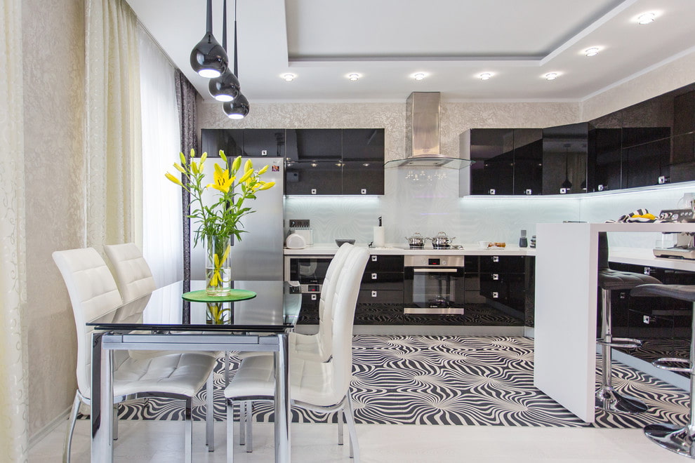 Fashionable prints with zigzags, squares, ovals, circles, rhombuses, plaid or striped coverings can not only set a certain character for the kitchen, but also affect its spatial perception in different ways.