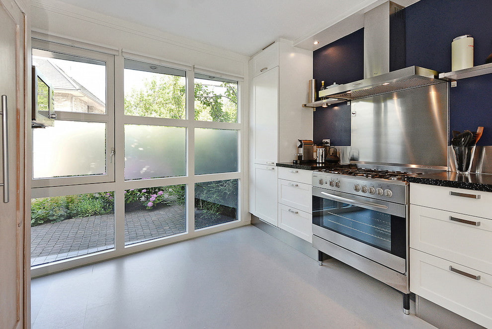 In the photo there is a blue linoleum of a semi-commercial type on the floor in the interior of the kitchen.