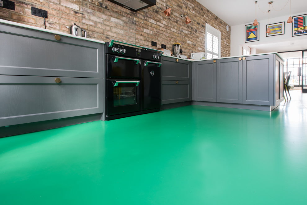 In the photo, the floor in the kitchen, decorated with green linoleum.