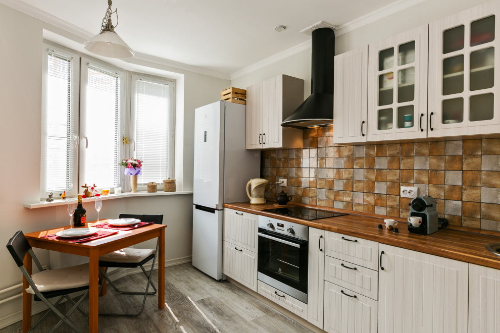 For owners small kitchen smooth facades are one of the best ways to visually enlarge the room... The gloss reflects not only the surrounding space, but also the light, so the kitchen seems a little larger. Perfect option - white facades, easy to care for and noble in appearance. Fingerprints and water droplets are better visible on black lacquered doors.