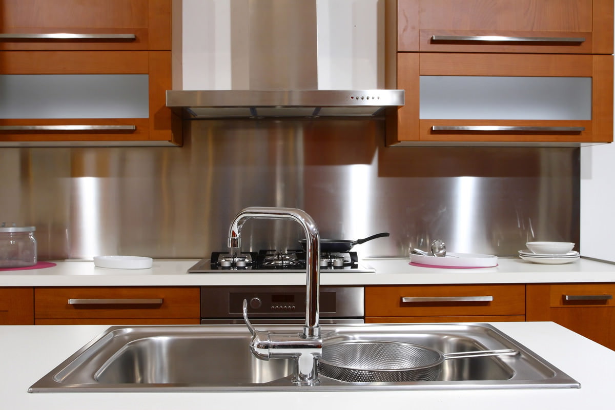 - A steel apron can be made from a stainless steel sheet. A fragment of the required size is cut out and glued to the base, which is usually moisture-resistant plywood or a chipboard sheet. This composite “cake” is attached to the wall.