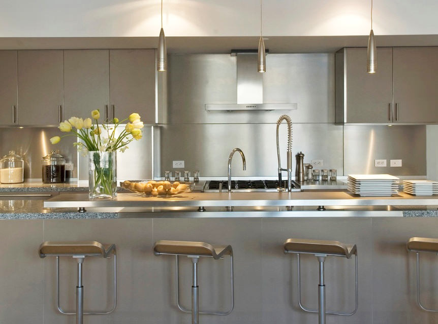 Sometimes you can hear the opinion that metal is too “cold” material, it will be uncomfortable in a kitchen decorated with it. However, combining it with the warm texture of wood, decorative plaster or wallpaper in delicate colors, you can get a very pleasant, delicate interior.
