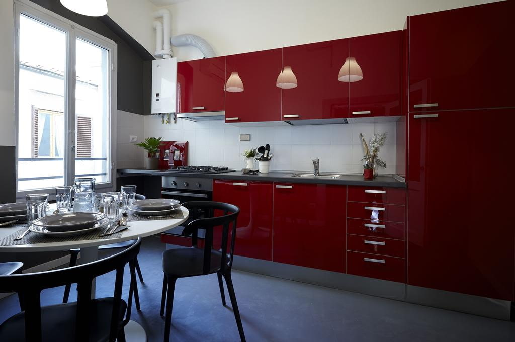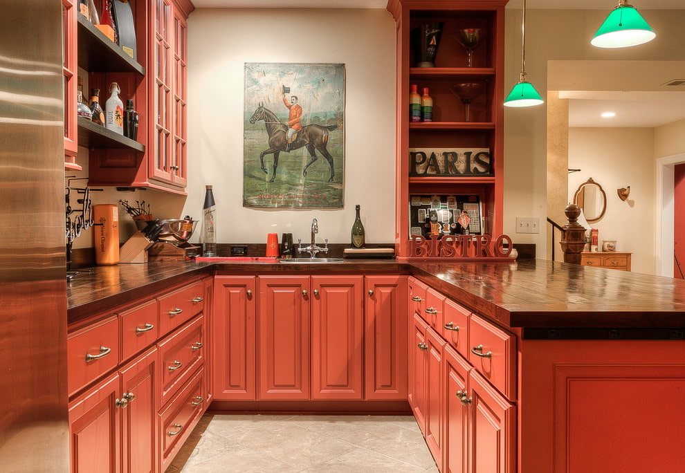 An unlimited number of facing materials can be used to decorate a red kitchen.