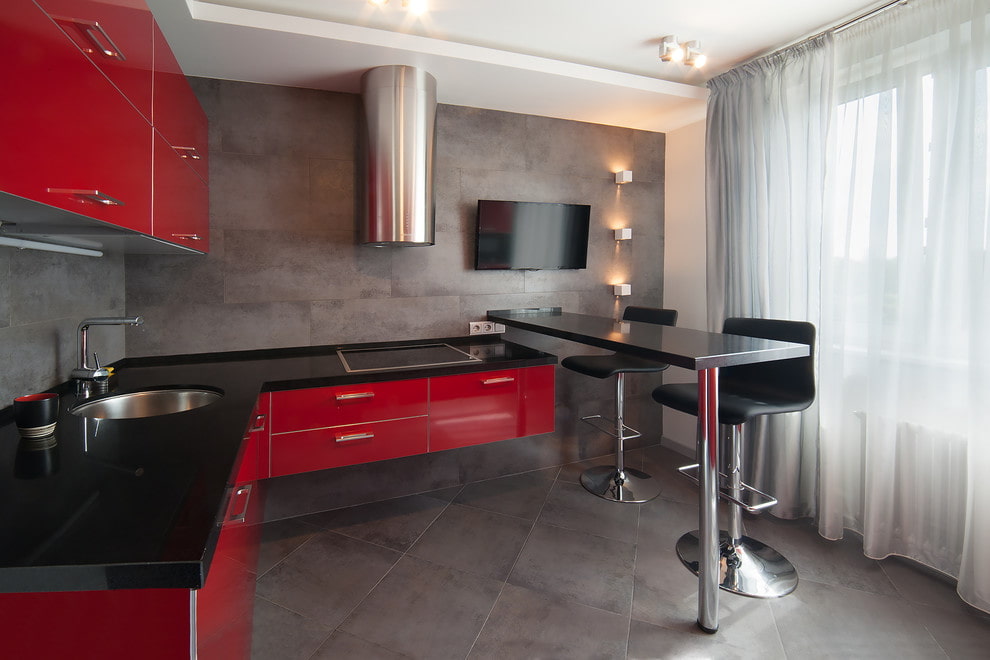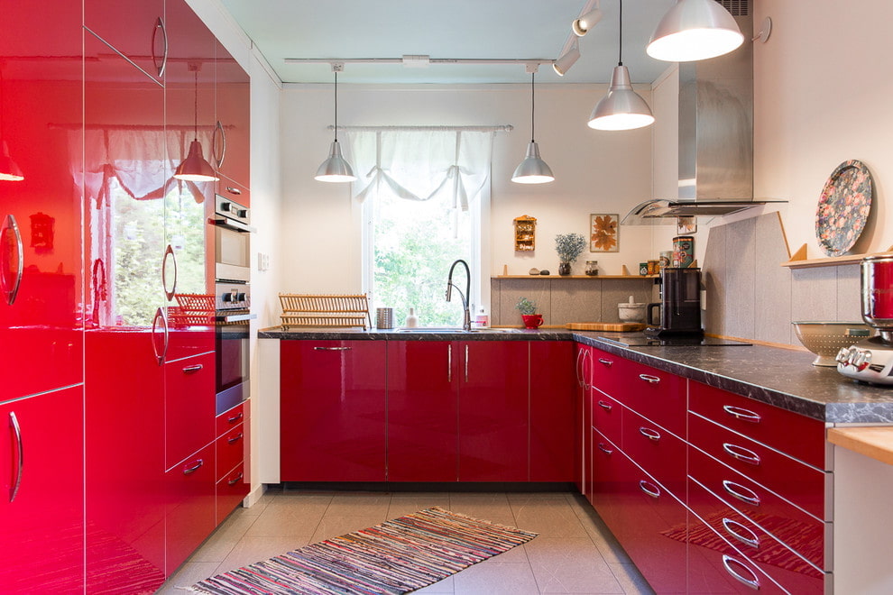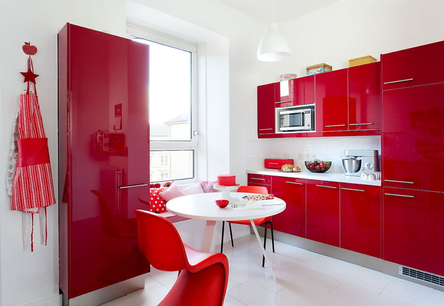 The red palette in the interior is a fairly relevant trend in modern design. Thanks to this color scheme, it turns out to turn an ordinary laconic kitchen into an attractive and stylish room.